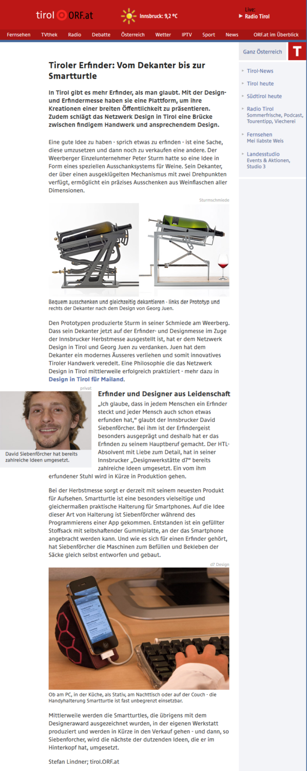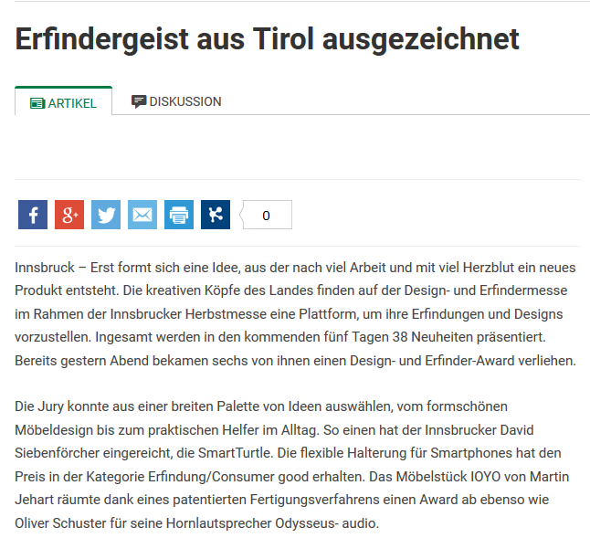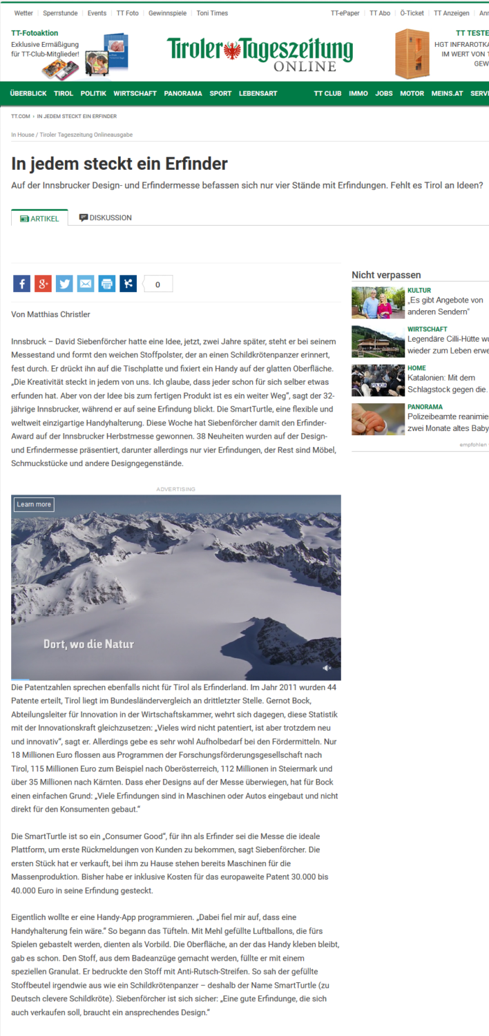 Im Herbst 2012 haben wir mit der SmartTurtle den „Erfinder Award Tirol 2012“ gewonnen.